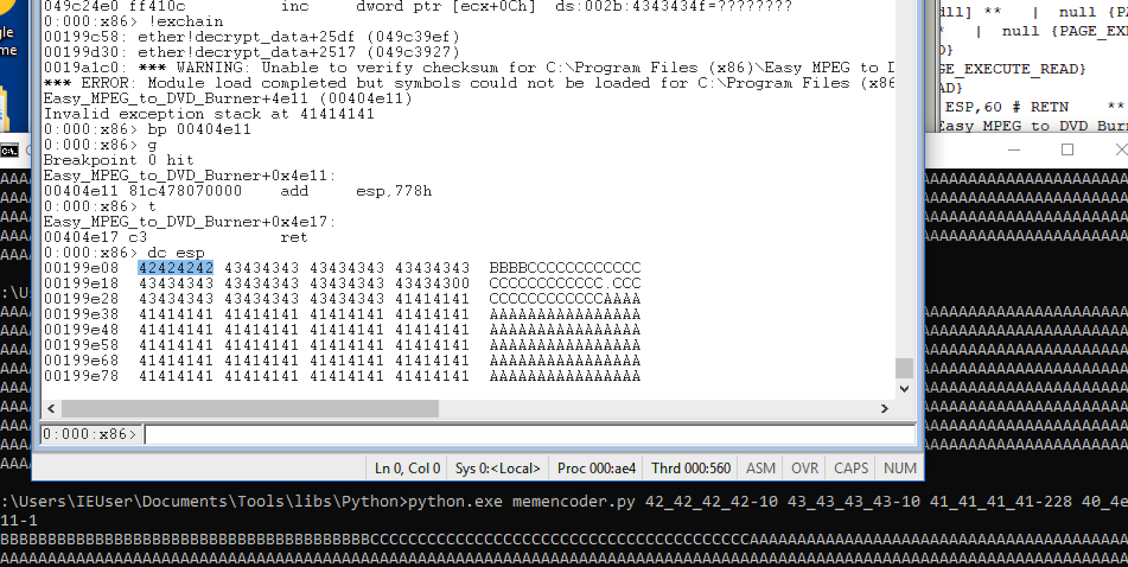 Now lets look at what happens when you corrupt the handler, after giving it 1000 characters (preferably "A"s) as input the process will cause an exception and you will be able to check out some stuff in WinDBG. Using memcoder you should give it 4-byte wide patterns to copy; it just makes reading memory values and comparing them in your head much much easier in my opinion. Also single chars will be printed with spaces between them because of how memcoder is scripted. Here's the command I used to generate my test payload of 1000 chars: