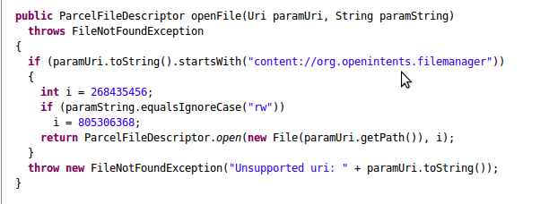OI File Manager (version 2.0.5) for Android suffers from a Path Traversal vulnerability. The vulnerability stems from inadequate protection of the org.openintents.filemanager.FileManager Content Provider and associated URIs.Here's the content provider causing the issue: